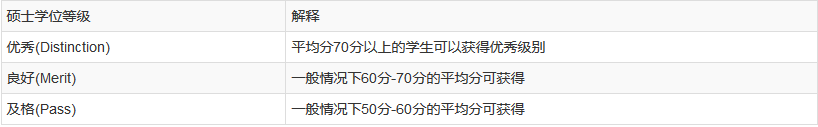 后高等教育碩士(比如: MA, MS, MEd, MSc)共分三個碩士學位等級(Post-graduate master’s degree class), 分別為“優秀”,“良好”和“及格”。