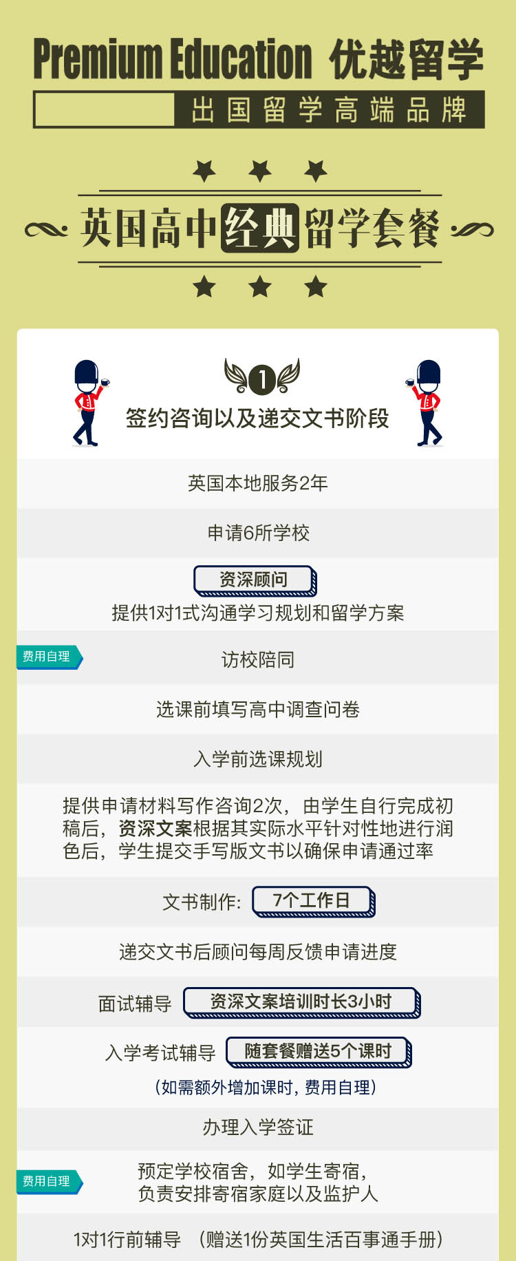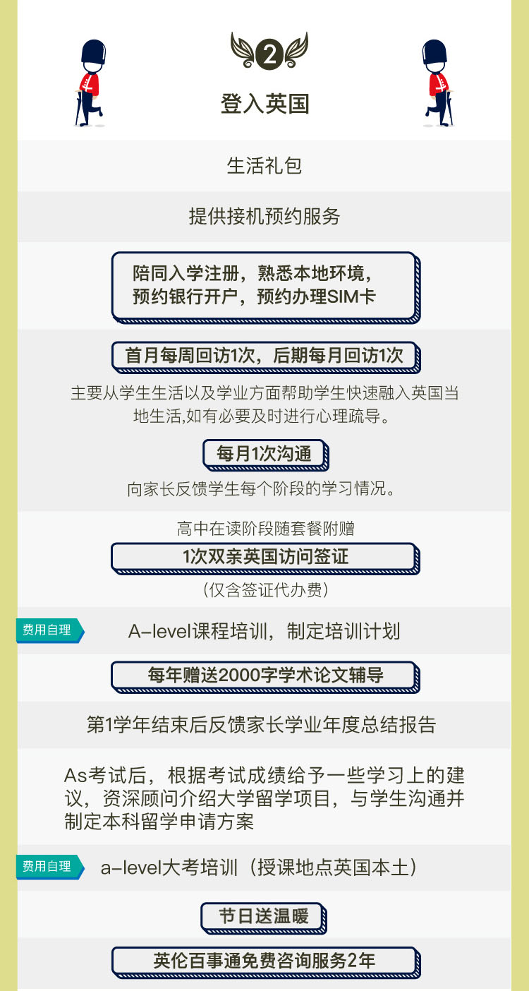提供2年完善的英國本土服務,資深顧問提供1對1式溝通學習規劃及留學方案,選擇最適合的學校及專業。資深文案提供2次申請材料寫作,高效提升申請通過率。7個工作日的文書制作周期,降低您等待中的焦慮心情。資深文案面試輔導3小時,讓您面試時更加自信從容。隨套餐附贈5個課時入學考試輔導,無論哪一科不理想都可以及時補給。1對1行前輔導,學生可以更周全快速的了解及融入當地生活。陪同入學注冊、熟悉本地環境、預約銀行開戶及辦理SIM卡;為初入英國的您解決一切顧慮,真正做到無憂出行。1次雙親英國訪問簽證。每年贈送2000字學術論文輔導,并提供二年的英倫百事通咨詢服務,讓您無需顧慮學業外的任何生活瑣事。