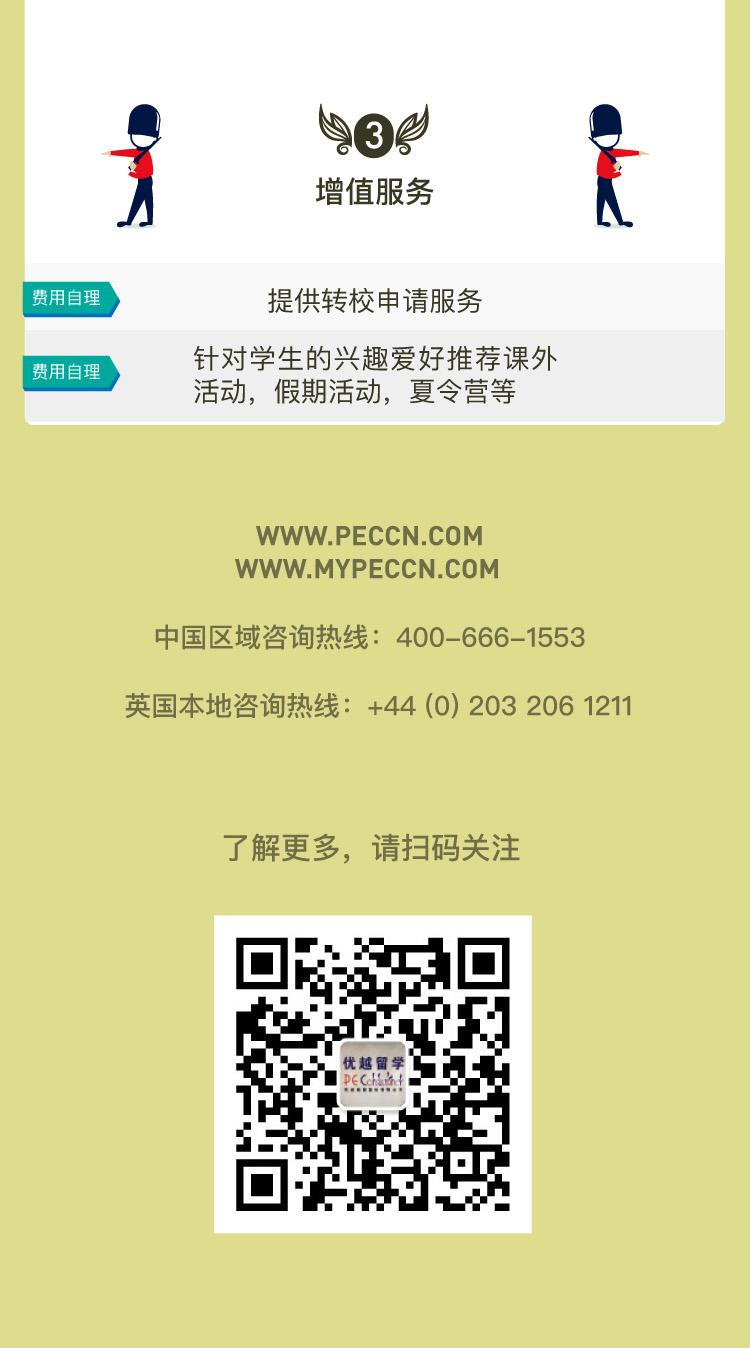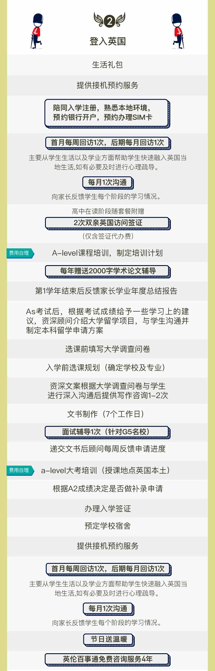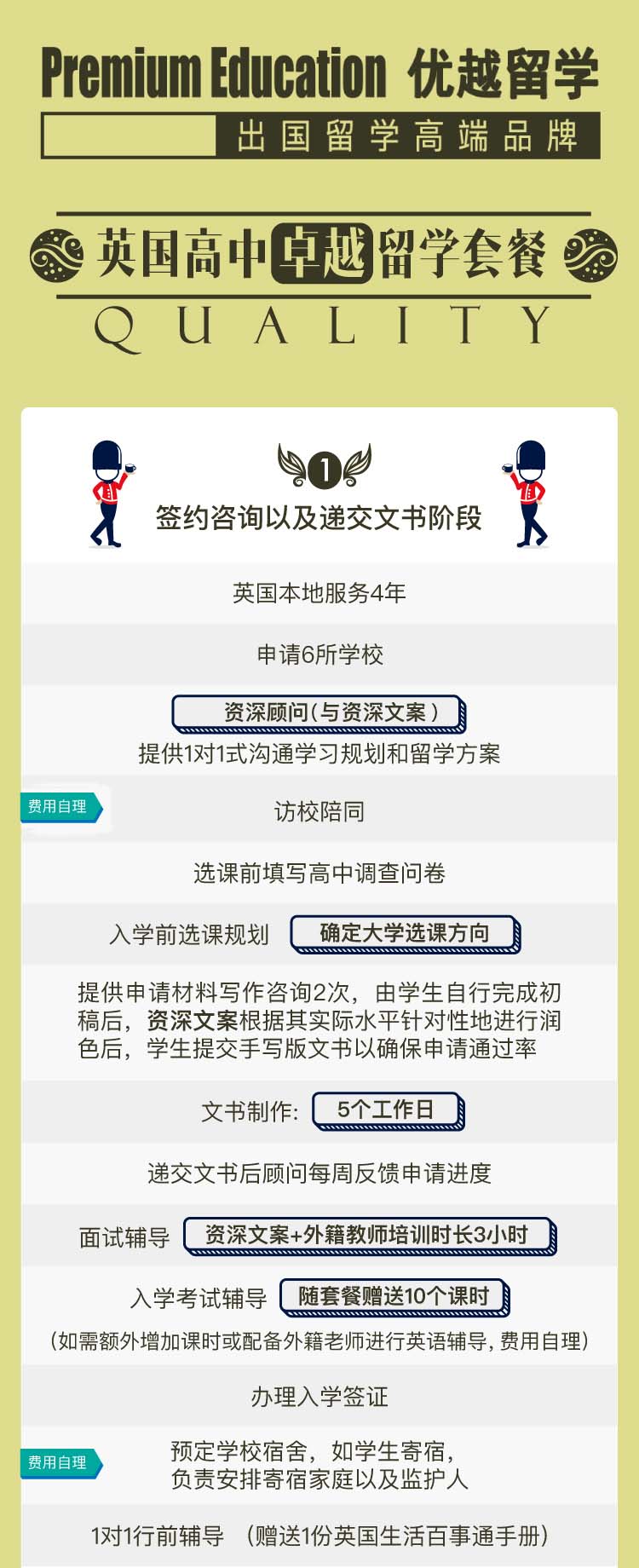 長達4年整完善的英國本土服務。入學前的選課規劃幫您確定大學選課方向。5個工作日的文書制作周期,降低您等待中的焦慮心情。資深文案攜手外籍教師進行3小時面試輔導,讓您面試時更顯自信從容。隨套餐附贈10個課時入學考試輔導,更全面的將您不足的科目進行補給。高中在讀期間2次雙親英國訪問簽證,在異國一樣有機會吃到父母做的飯菜。每年贈送2000字學術論文輔導,并提供四年的英倫百事通咨詢服務,給您周全的照顧,讓您無需顧慮學業外的任何生活瑣事。