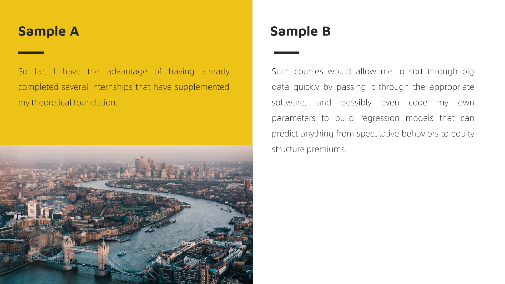 每一個招生官都需要查閱幾百份申請文書,如何在眾多文書中脫穎而出至關重要。文案會根據學生的信息反饋,為學生塑造一個獨特富有個性的優質形象,并且會要求學生對行業以及專業的進行深入思考,對于學生問卷中內容能進行有效的延展,能結合學生自身情況和專業要求進行信息整合,側重院校要求,補充最豐富最生動的細節。