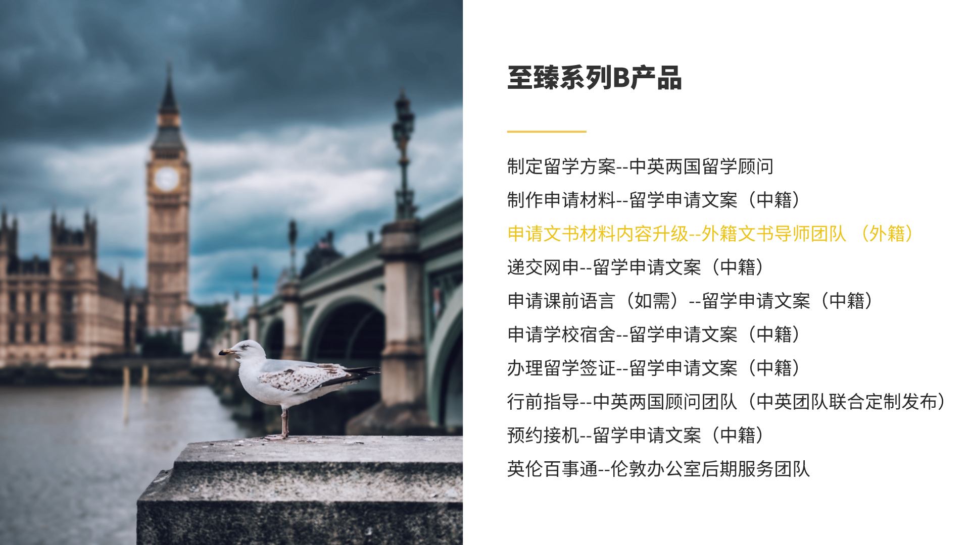 中英兩國顧問團隊,根據不同學生的申請需求提供個性化申請指導;高端中籍文案&外籍文書導師深度升級文書創作體系,給以世界知名院校為目標的學生提供具備競爭力的文書服務,幫助學生申請到理想院校!