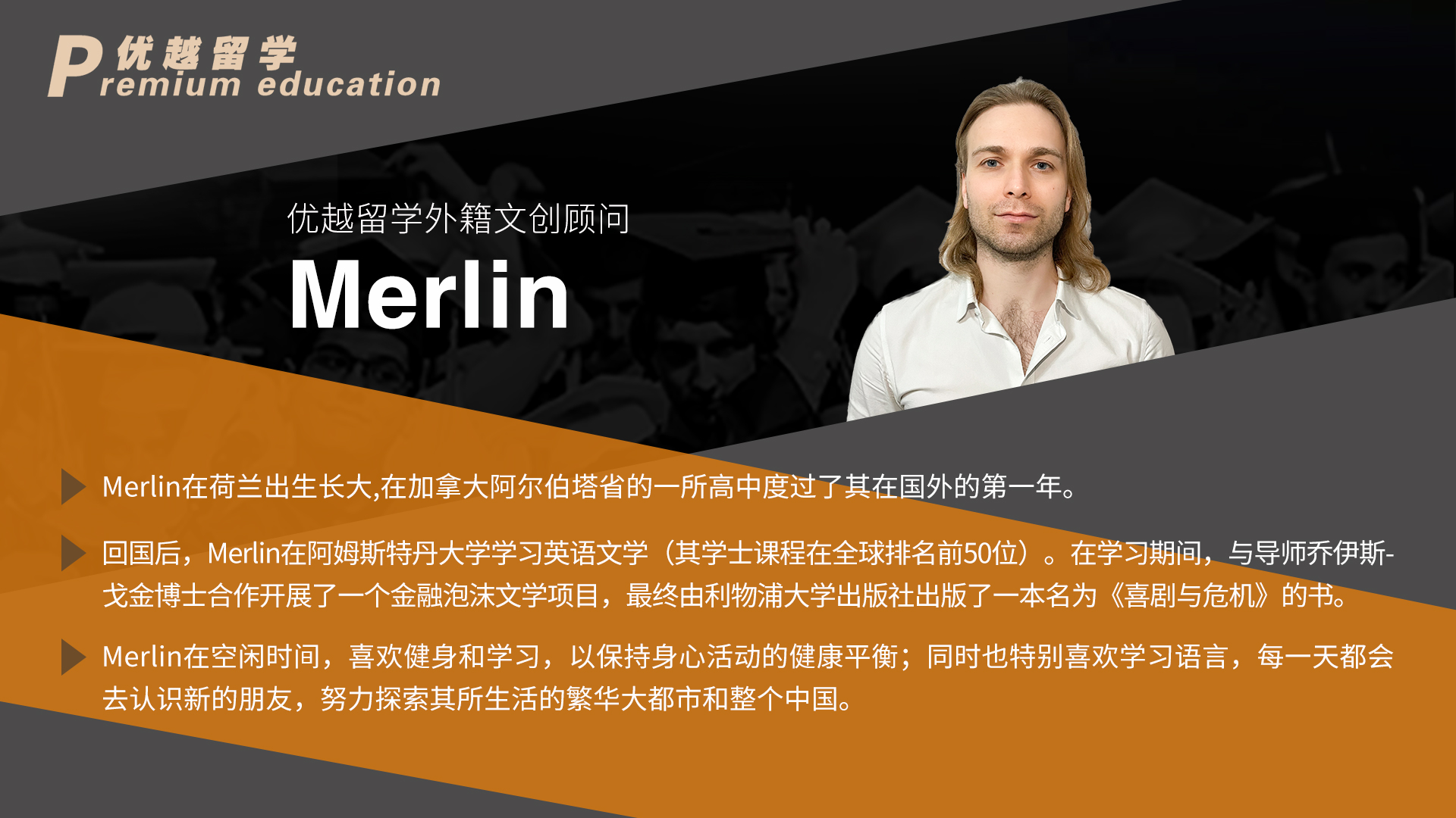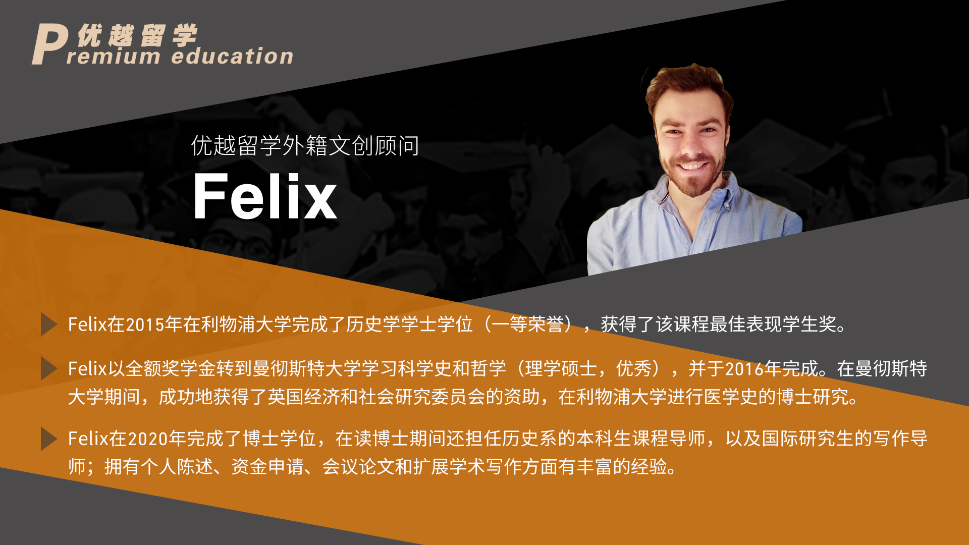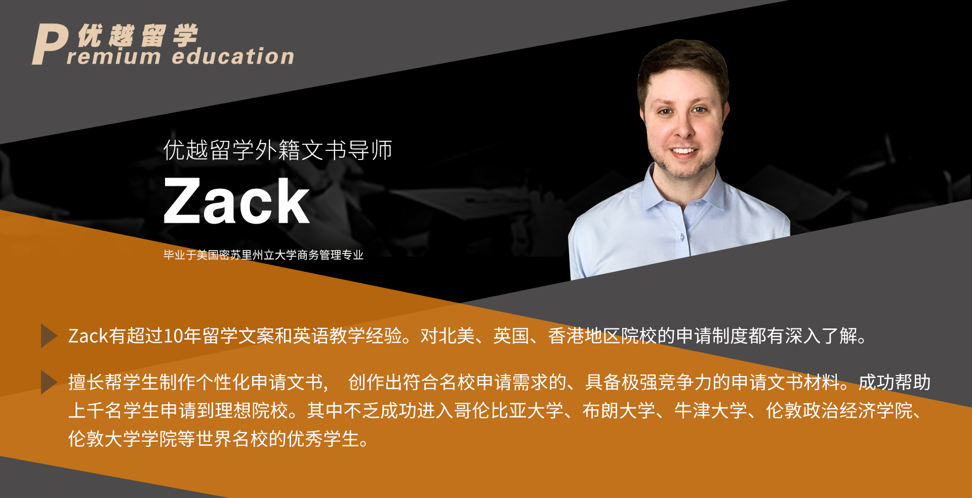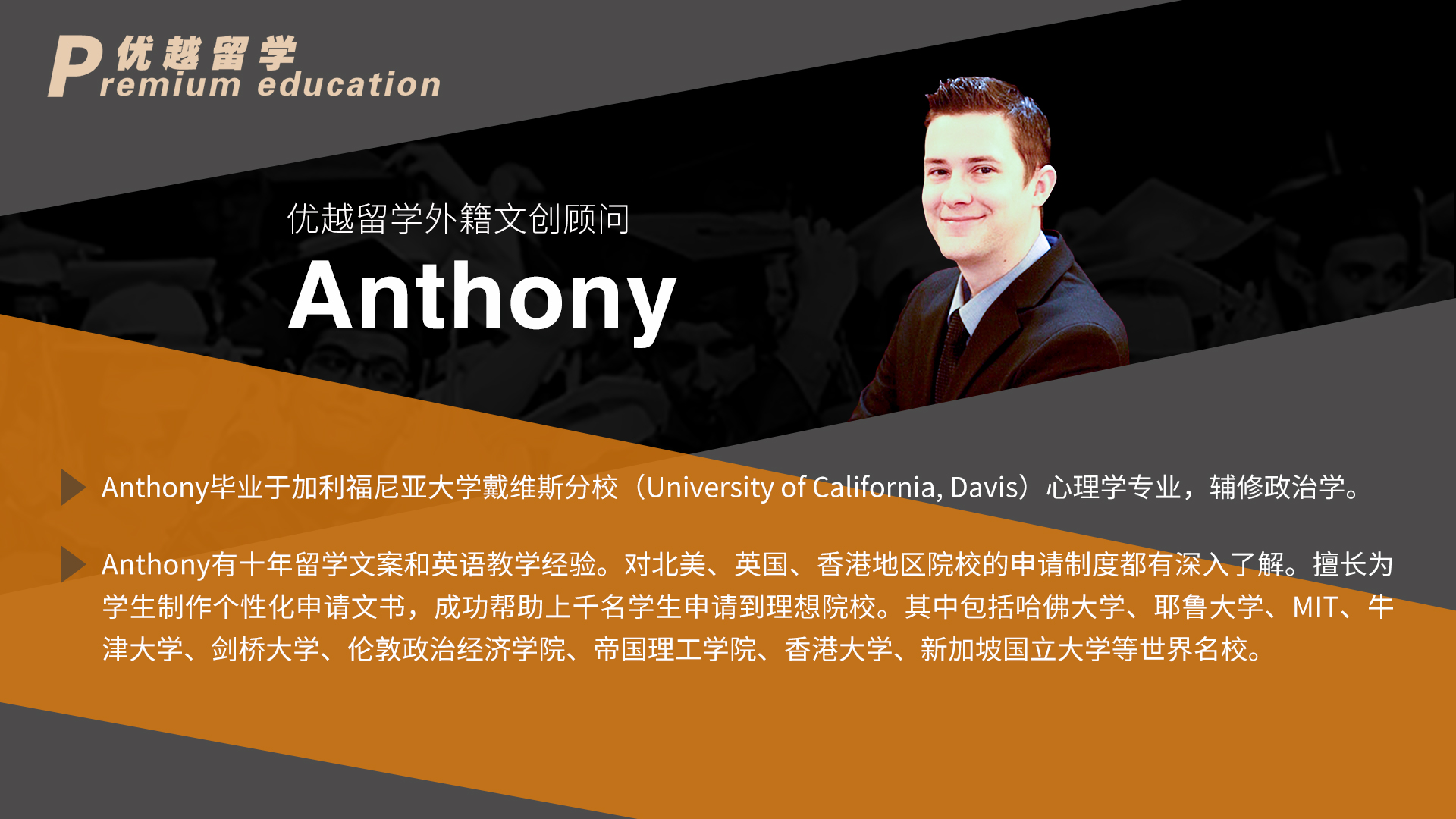 留學申請高端時代來臨,海外院校對于申請人的考察體系綜合性更強,考核維度也更加多元。想要在激烈而復雜的留學申請競爭中獲得優勢,優質的申請文書材料是重中之重。優越留學2020年全新升級的“至臻系列”留學服務產品重點在于對申請文書質量的提升,組建了由Georges領銜的一批具備海外名校教育背景且具備豐富的海外頂級院校申請文書指導經驗的外籍文書指導團隊,全面升級優越留學的文書產品體系,為選擇優越的學生提供具備極具競爭力的申請文書材料,助力世界頂級名校申請之路。