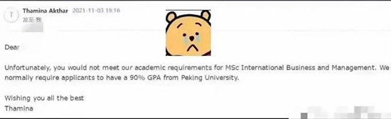 L同學來自一所211院校,均分成也很接近90,從硬性背景來說自然是非常優秀的,但是她找到我們優越留學的時候,明顯是非常不自信的狀態,因為那段時間整個微博到處都是高分被拒的案例,其中甚至不乏985/211背景90+的均分被G5無情拒絕的case,包括還有那封著名的郵件截圖