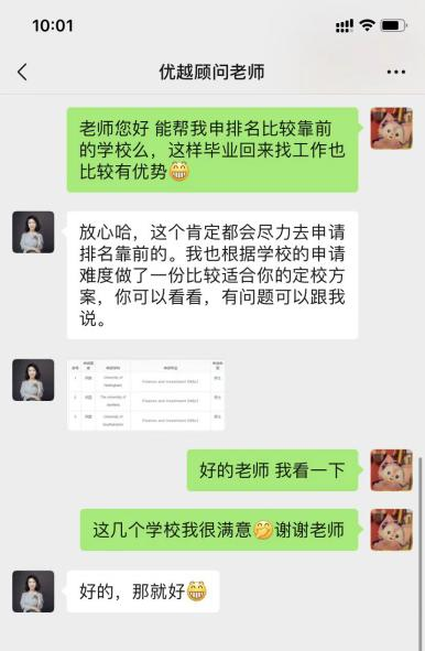 2.我的顧問老師真的非常nice,很耐心的跟我分析專業、學校以及費用方面的問題,不厭其煩的根據我自己的背景情況去做定校方案,一直努力的在想著怎樣才能幫我申請到更好的學校。