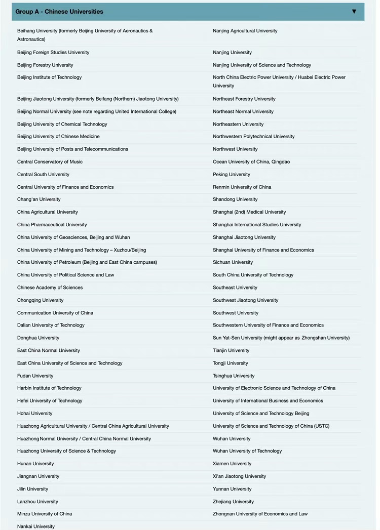 北京航空航天大學(原航空航天北京大學)、北京外國語大學、北京林業大學?、北京理工學院?、華北電力大學、北京交通大學(原北方北方交通大學)、北京師范大學(見聯合國際學院注釋)、北京化工大學、北京中醫藥大學?、北京郵電大學?、北京科技大學?、中央音樂學院、北京大學?、中央財經大學?、中國人民大學?、對外經濟貿易大學?、中國地質大學(北京和武漢)、清華大學?、中國傳媒大學?、中國礦業大學-(徐州/北京)、中國石油大學(北京和華東地區校區)、南京農業大學、?南京大學、?南京理工大學?、東北林業大學??、東北師范大學、??東北大學、?西北工業大學、?西北大學、?中國海洋大學?(青島)、中南大學、?長安大學?、山東大學、?中國農業大學?、上海第二醫科大學?、中國藥科大學?、上海外國語大學、??上海交通大學、?上海財經大學、?四川大學、?中國政法大學?、華南理工大學?、中國科學院?、東南大學、?重慶大學?、西南交通大學、西南大學?、大連理工大學?、西南財經大學??、東華大學?、中山大學、華東師范大學?、天津大學?、華東理工大學?、同濟大學?、復旦大學? 、哈爾濱工業大學?、中國電子科技大學?、合肥工業大學?、河海大學、華中農業大學、中國科技大學(USTC)、?華中師范大學?、武漢大學?、華中科技大學?、武漢理工大學?、湖南大學?、廈門大學?、江南大學、西安交通大學、?吉林大學?、云南大學、??蘭州大學?、浙江大學、?中央民族大學?、中南財經政法大學?、南開大學