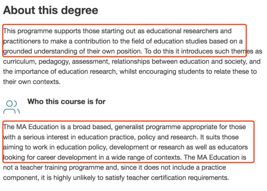 顧問老師很有耐心的帶著我解讀UCL官方的政策,官網中明確指出“UCL的教育專業研究生傾向于對教育實踐、政策和研究有濃厚興趣的人。適合志愿從事教育政策、發展或研究工作的人,以及在廣泛背景下尋求職業發展的教育工作者。尤其是對于教育行業研究想要深入挖掘的申請人。”可以看出UCL的該專業以研究為主,實習并不是那么的重要。面試官主要看你有沒有教育或相關的研究經歷,并非實習經歷。