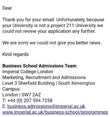 帝國理工商學院相信大家都不陌生,所開設的商科項目每年申請人數都非常多,但在今年帝國理工商學院在回復申請學生的郵件中表示:因為申請者的學校并非是211大學,因此他們不再考慮改申請。所以帝國理工商學院可能已經逐漸開始不考慮雙非院校學生的申請,即使部分高均分的學生未來申請了也不會給到面試的機會。