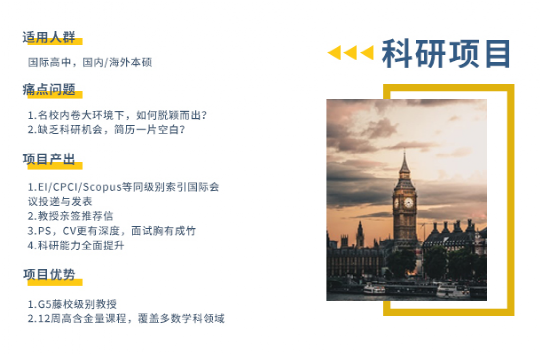 抓緊所有時間提高背景,把握每項可以提升背景的機會。優越留學推出碩士申請中的軟背景提升的科研項目以及實習項目等產品幫,能助同學在申請中更加有保障。如果各位同學有需要,可以跟優越的顧問老師咨詢,顧問老師會幫同學們推薦合適的背景提升項目。