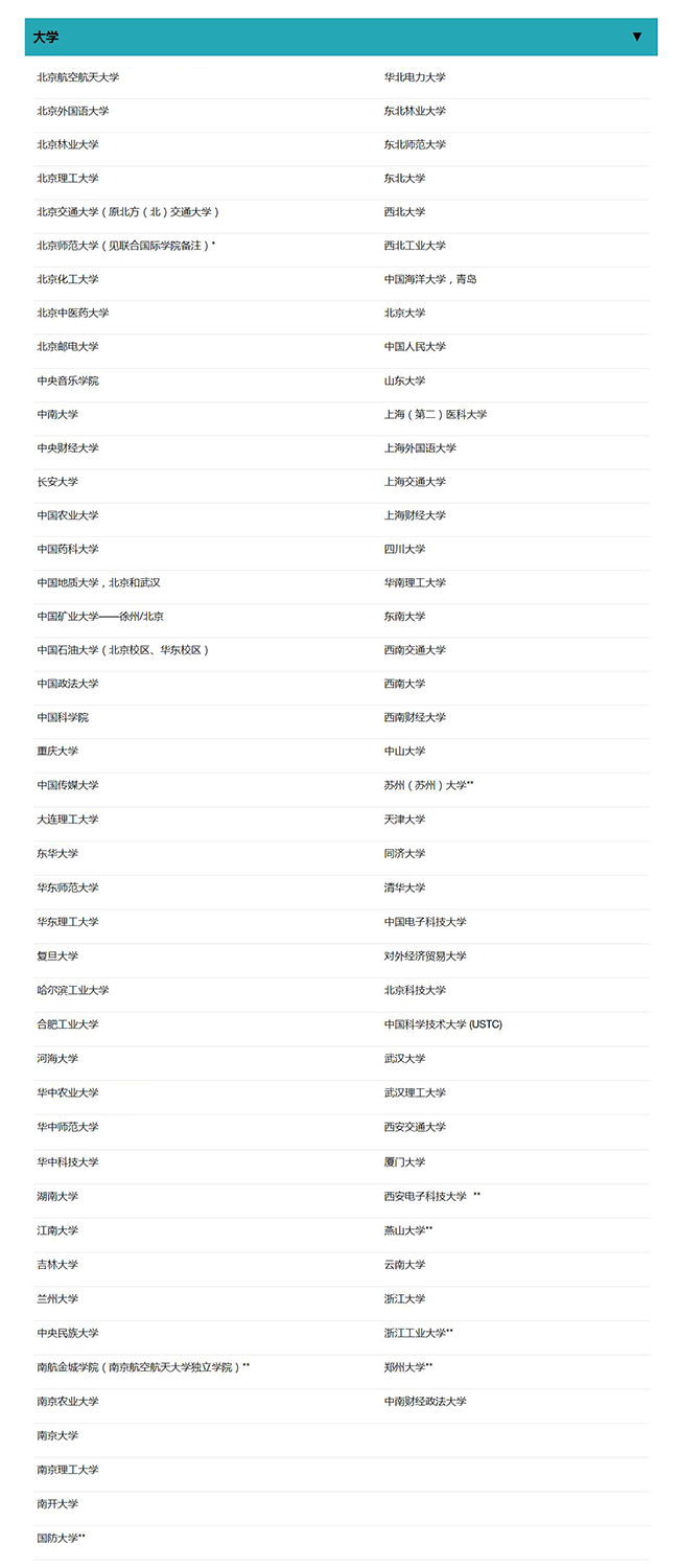 這次更新直接將Group A和Group B合并為一個list,包含主要的985和211院校,需要注意的是并非所有985/211院校都在這個名單內,同時還有三本獨立學院南航金城學院也包括在內,名單共84所院校。