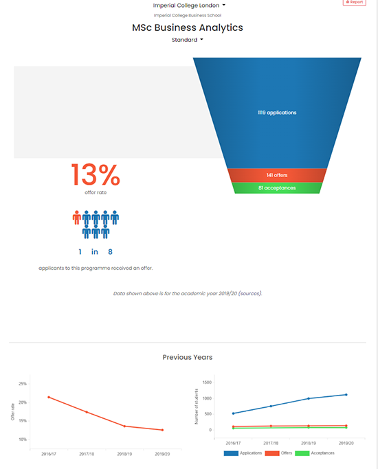 根據admissionreport.com的數據統計,IC的商業分析專業在2019-2020年度的申請量有1119個,而錄取量只有141個,也就是錄取率為13%,也就是8個人在競爭一個錄取。根據圖中之前年份的分析,IC發放offer的數量在漸漸下降,而申請的人數在逐年上漲,可見競爭只會越發激烈。