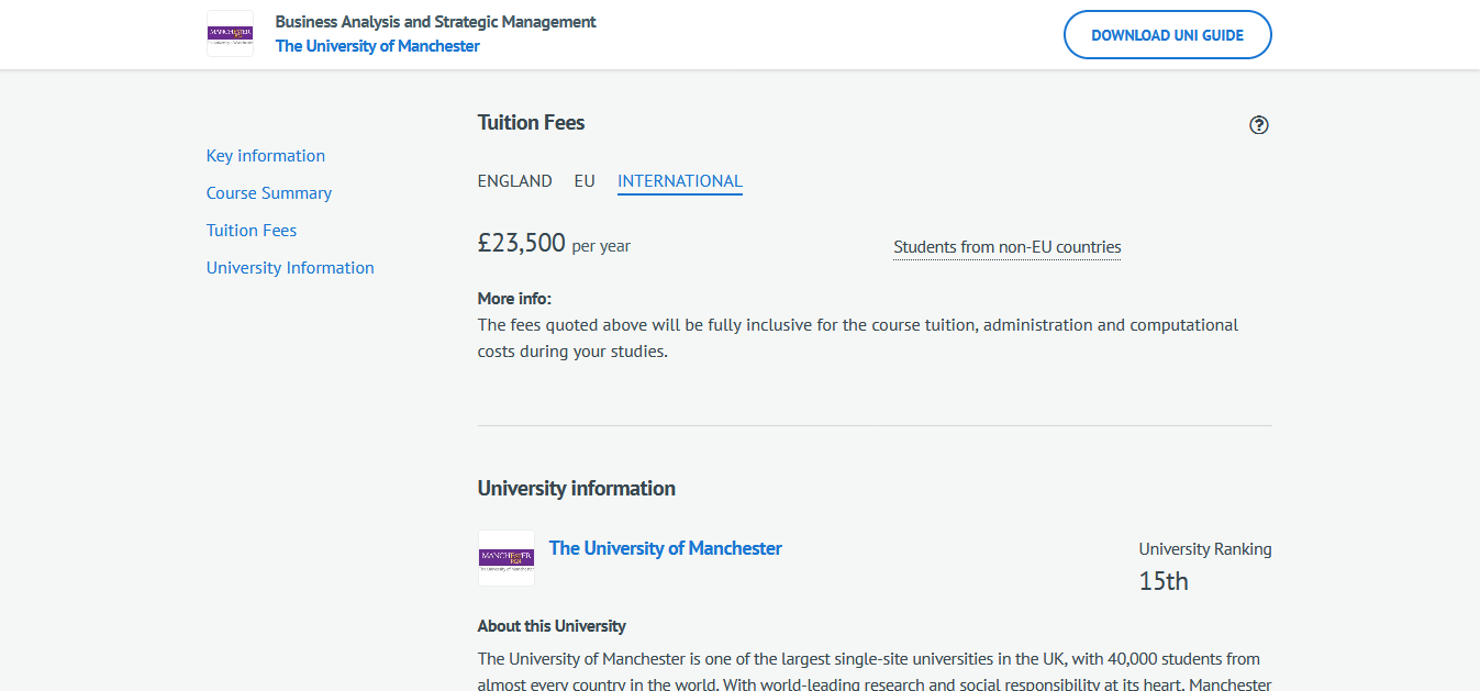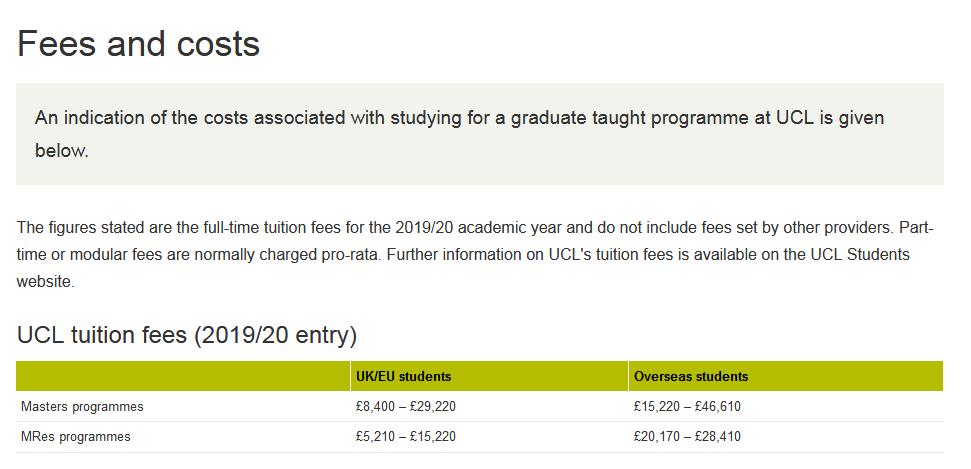 學費:英國碩士課程時長為1年,除部分商科、傳媒和醫學類較高以外,一般平均每年學費在£12000-£24000之間(倫敦地區/世界排名靠前的院校學費一般來說都相對更高一些),工商管理碩士MBA一般在£35000-£44000之間。(重點關心這部分的建議直接往后拉,教你如何查詢具體課程的準確學費金額)