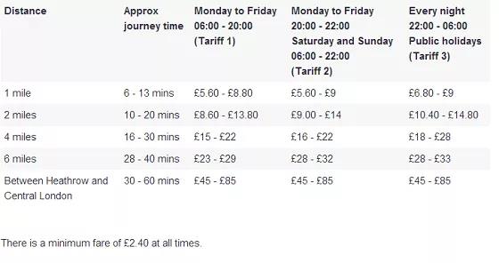 周末的中小型轎車租費在£70-80;出租車收費請看下圖,起步價最低有£2.40,15分鐘車程至少10鎊。