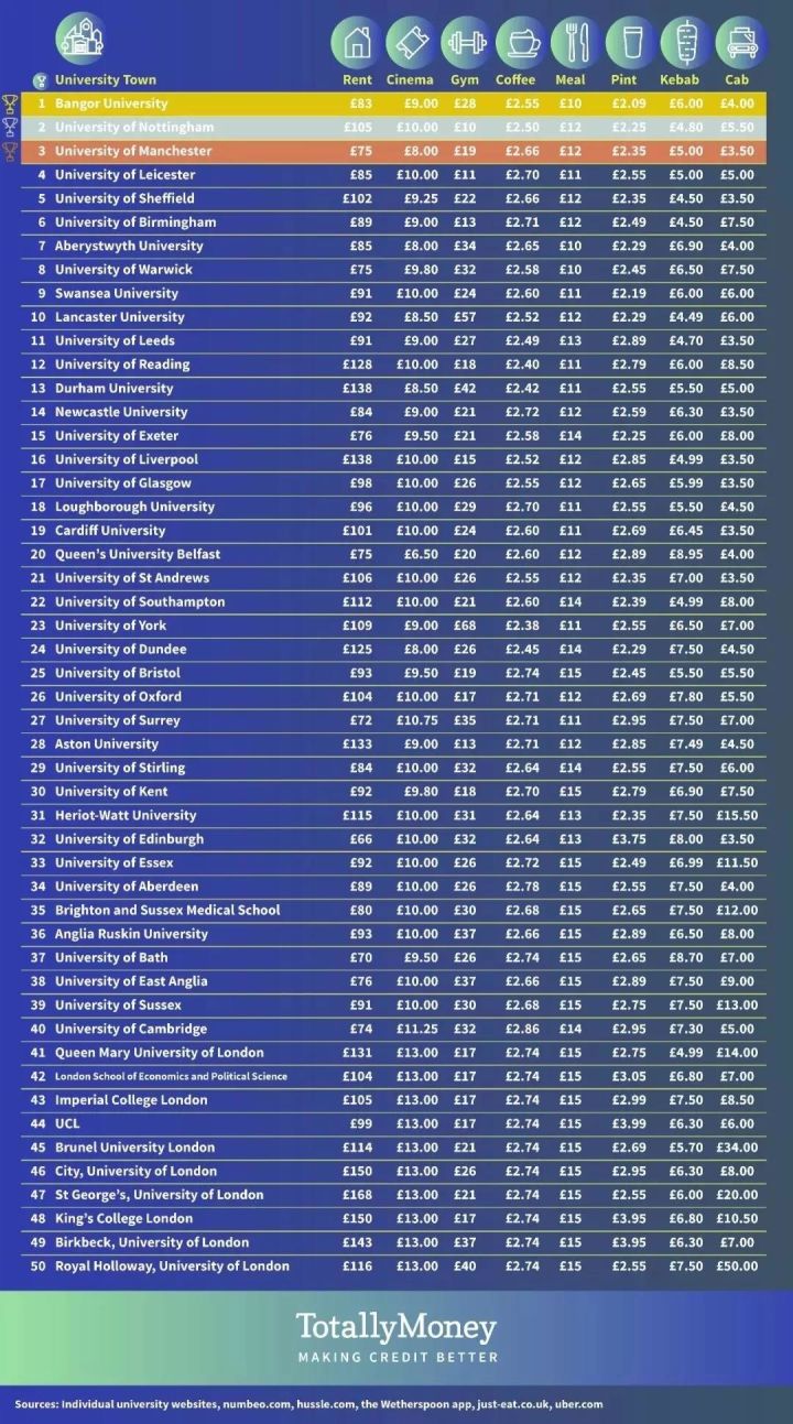 可以給大家看看2019年底英國“Totally Money” 網站為大家整理出的【2019英國最省錢大學排行榜】。榜單從