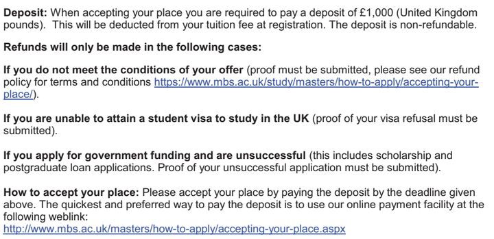 在獲得學校offer后,需在收到offer的一定時間內(通常是28天)繳納一筆offer押金,也有同學稱之為留位費,一般在1000-2000英鎊左右(可以視作提前交部分學費),具體金額和提交時間大家可以查看offer中deposit部分說明,按照規定的時間繳納規定的金額即可。無特殊情況,留位費是不會退還給學生的。