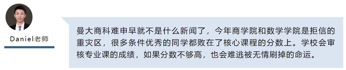 曼大環發學院今年也調整了list,將中國學校分為三類,均分最低要求在80-82分。但從實際情況來看,成績至少需要達到85分。即便本科院校在名單上還算優秀,科研實習也很豐富,都難以彌補學術上的差距。