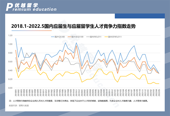 根據獵聘大數據研究院發布的《2022 海外應屆留學生就業競爭力洞察報告》數據顯示:普遍來說應屆留學生的人才競爭力比國內應屆生更高,呈現出海外QS100 > 海外非QS100≈國內 985/211 > 國內非 985/211的走勢。