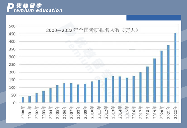 21年考研人數首次突破300W大關,2022年全國碩士研究生報名人數突破457萬,比2021年增長80萬,增幅為21%。