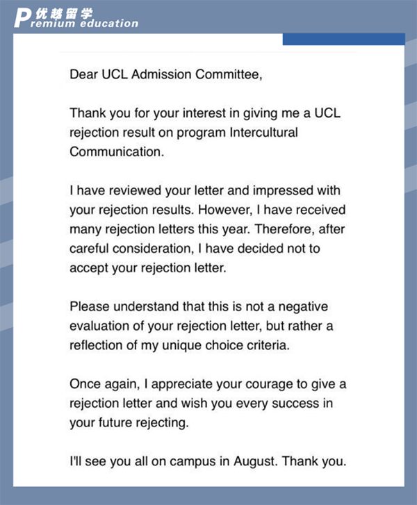 試問誰沒收到過幾封拒信呢?我拿到拒信后就“敬個禮、握握手”,天涯何處無芳草?因為顧問給我定校是按照沖刺——主申請——保底三個梯度來選學校,拿到沖刺的UCL拒信,我就對G5不抱希望了,重新申請了KCL。然后曼大也拒了我,不慌,華子在等我。申請留學本來就是雙向選擇的過程,與其把時間浪費在已經拒絕你的人身上,還不如拿著愛的號碼牌換個隊再排......