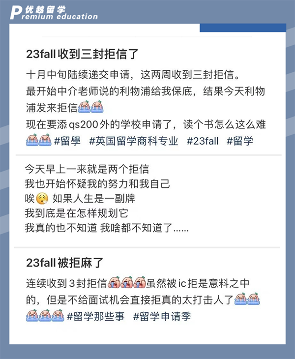 23fall英國留學申請一輪審理正在進行中,局部學校下起了“拒信雨”。據優越君觀察,面對突如其來的拒信,不同的人有不同的反應。