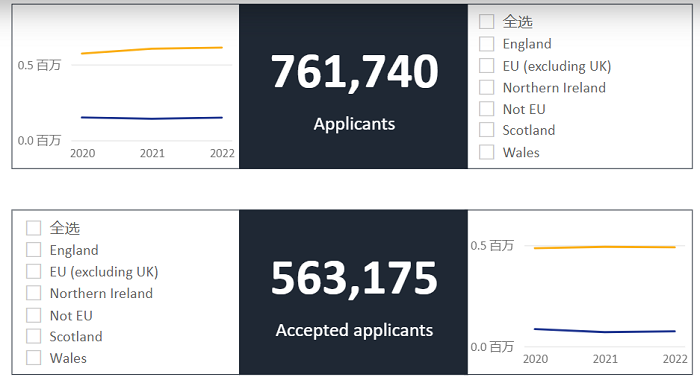 根據UCAS官網數據,截至2022年申請周期結束,英國大學申請人數為761740,較去年的746120增加了15620個申請者,2022年最終的錄取數量為563175人,僅比去年增加了1115人。