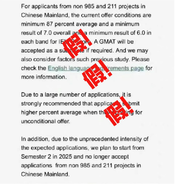 這個在小紅書流傳甚廣的郵件截圖末尾寫到:we plan to start from Semester 2 in 2025 and no longer accept applications from non 985 and 211 projects in Chinese Mainland.