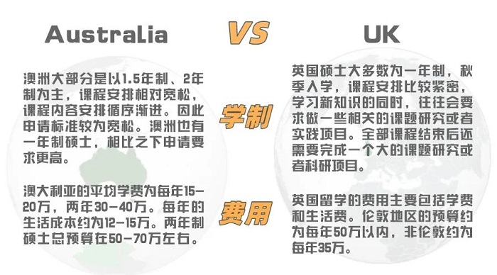 在國家選擇的時候可以考慮預算和回國就業的認可度:英國院校認可度>澳洲;英國留學費用<澳洲