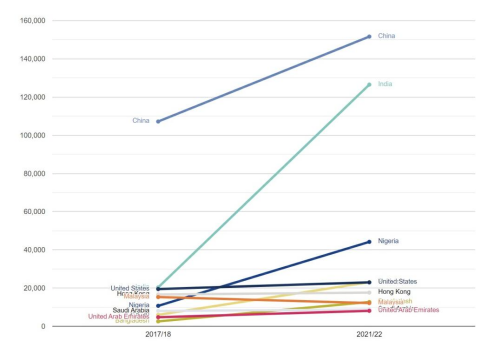 根據近日英國高等教育統計局(HESA)公布的數據,2021/22學年英國留學生總人數漲至68萬(比去年上漲12%),中國的學生總數最多,有17萬人,其中151,690人來自中國大陸。