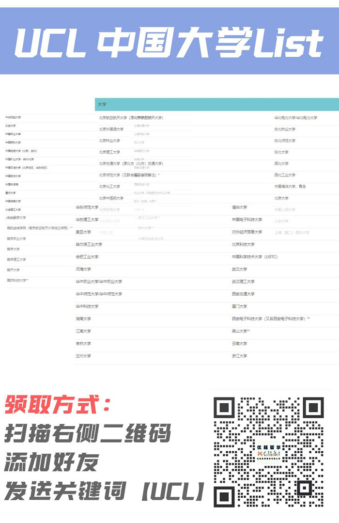 這份UCL發布的認可中國大學名單大家可以去校方官網找到,急需的同學也可以添加小助手領取一下。(下圖掃碼添加小助手發送【UCL】即可)
