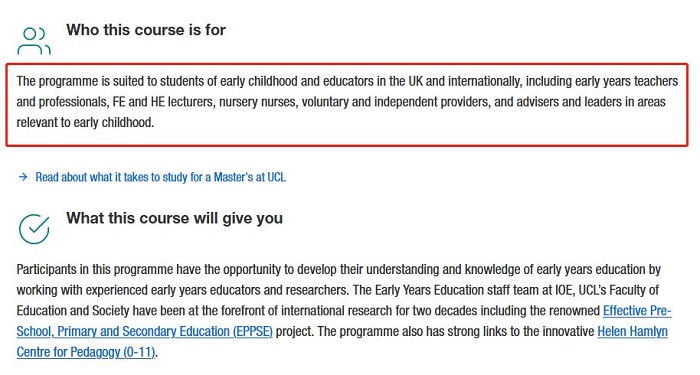 UCL教育學院享譽全球,連續9年摘得世界第一的桂冠。教育學院開設的專業也很豐富,既有適合研究型人才的Education MA專業,也有適合實操型選手的專業,比如Early Years Education MA。學校官網明確表示該課程項目適合學前教育專業的學生以及教育工作者,包括早教幼師、FE和HE講師、托兒所護士、以及其他相關人員。