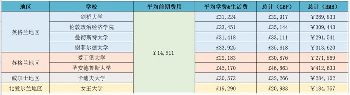 英國分為英格蘭、蘇格蘭、威爾士、北愛爾蘭這幾個地區,幾個地區生活的風格各不相同,開銷費用也不同;大學的學費又因專業不同而學費不同,越熱門的專業學費越貴。