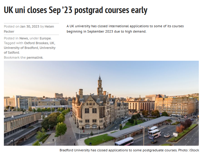 雖然英國的留學申請6、7月份才截止,但優越君要提醒大家的是,英國碩士申請的時間還沒截止。如果你考慮好了就不要猶豫,因為機會不多了!接下來,可以跟著優越君來了解一下目前的留學申請院校情況吧!最近優越君刷到一篇報道:一所英國大學由于申請量過大,目前已經提前關閉了部分課程的國際申請。那么,同為23fall的你,研究生申請進度如何?