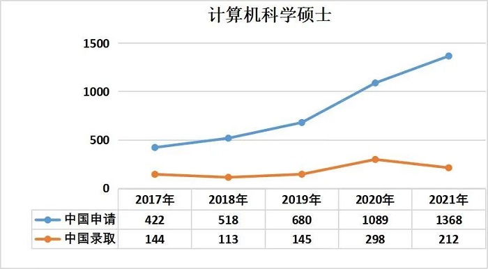 愛大的計算機科學這個專業比較有意思的一點是在2021年的時候,專業申請人數1854人,其中70%以上是中國學生在申請(有1368人,占74%),同年該專業的錄取率是15%,而中國學生申請成功率是16%。