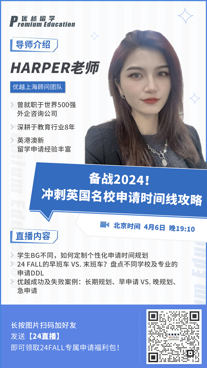 4月6日晚19:10,鎖定英國優越留學視頻號,蹲守直播間,來自優越上海團隊的Harper老師將為24Fall們分享超全的申請指南和時間線規劃!