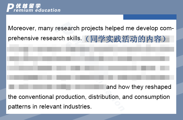 有同學本科期間有過多段的實踐經歷,但并不能將所有經歷悉數放入文書中,這樣做不僅會浪費本來文書就十分有限的字數,而且也不能重點展示出學生本人與院校相匹配的實踐能力,而且大量素材的無效堆砌只會讓招生官覺得學生在不知所云。