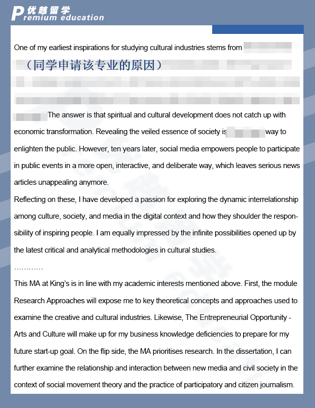 KCL的CCI專業會重點考察申請者的學術能力,即對CCI的廣泛理解;以及學習CCI的興趣和能力。因此W同學的PS中不僅表現出了同學個人的學術興趣,而且與CCI教學的廣泛主題相匹配,包括文化理論和歷史、文化生產、文化消費和文化治理,而且還將個人的職業興趣與CCI的教學重點領域相對應,包括視覺文化、博物館、流行音樂、電影和數字文化,最終成就了一份非常符合該項目招生官期待的PS。