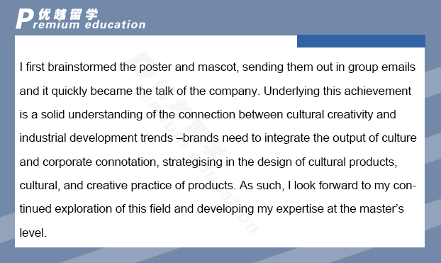 而華威的文書內容關鍵是展現出學生在文化創意與商業關系上的獨特見解,這在Z同學的文書中體現在實踐的收獲上,通過2段相關的實踐經歷,Z同學對文化創意和產業發展趨勢之間的聯系有了堅實的理解——品牌需要整合文化輸出和企業內涵,在文化產品設計、文化和產品創意實踐中制定戰略。