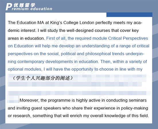 文書老師發現這樣的問題,立即指正,作為一名教育專業的申請者,申請理由可以結合本科的學術經歷。文書老師幫助Z同學拆分了KCL教育學的課程設置,并引導該同學闡述未來規劃并進行結合,例如Z同學的PS中去描述KCL“教育批判觀點”的模塊可以幫助同學對支撐當代教育發展的社會、政治和哲學趨勢的一系列批判觀點進行理解。