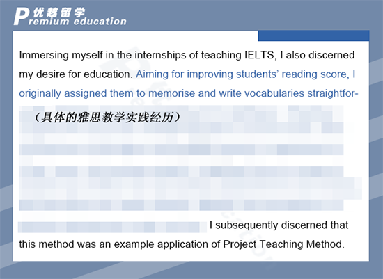 例如在文書老師的幫助下Q同學PS在描述雅思教學經歷時,更是詳細分析了這段經歷中Q同學對于雅思學習方式的思考和理解,在教學中,Q同學嘗試用自己理解創造的方法論去教導學生,并最終取得了一定的成績。