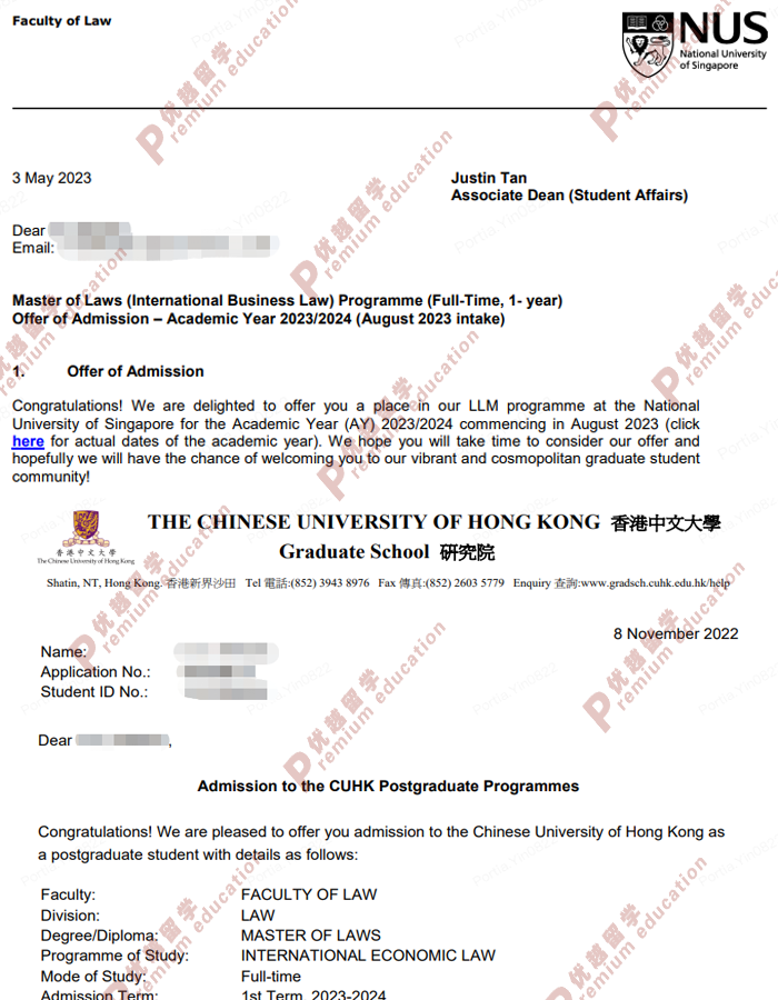要論法學生的理想院校,香港中文大學必然有一席之地。Y同學作為一名典型的政法學子,一直想通過申請碩士留學提升自己的專業水平和法律素養。由于我們很早就幫她做了規劃,23fall一輪申請中Y同學早早拿到了港中文國際經濟法和中國商法的offer。申請季開了一個好頭,后續又連接收到了華威、曼大、新國立、澳國立等世界名校錄取,贏得大滿貫。