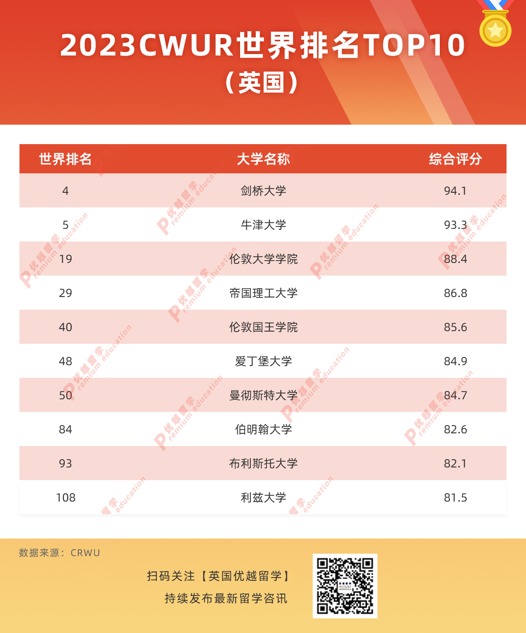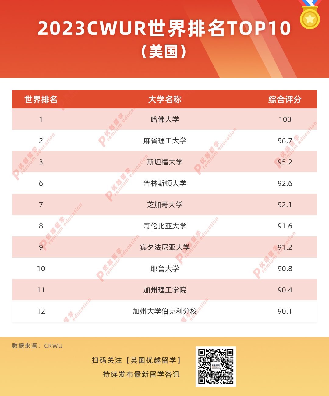 CWUR全球公私立大學20,00基于客觀數據指標質量教育、畢業生就業、質量教職員和研究表現等指標