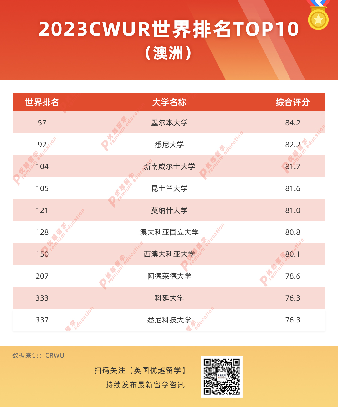 今年澳大利亞有39所院校榮登排行榜,其中墨爾本大學和悉尼大學進入了top100。澳洲“八大”院校除了阿德萊德大學之外都成功進入了世界前150名。