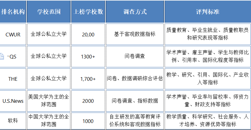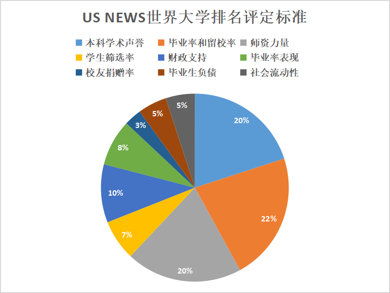 U.S.News美國大學為主的全球范圍2000問卷調查、指標數據學術聲譽、畢業率與留校率、師資力量、財政支持等指標