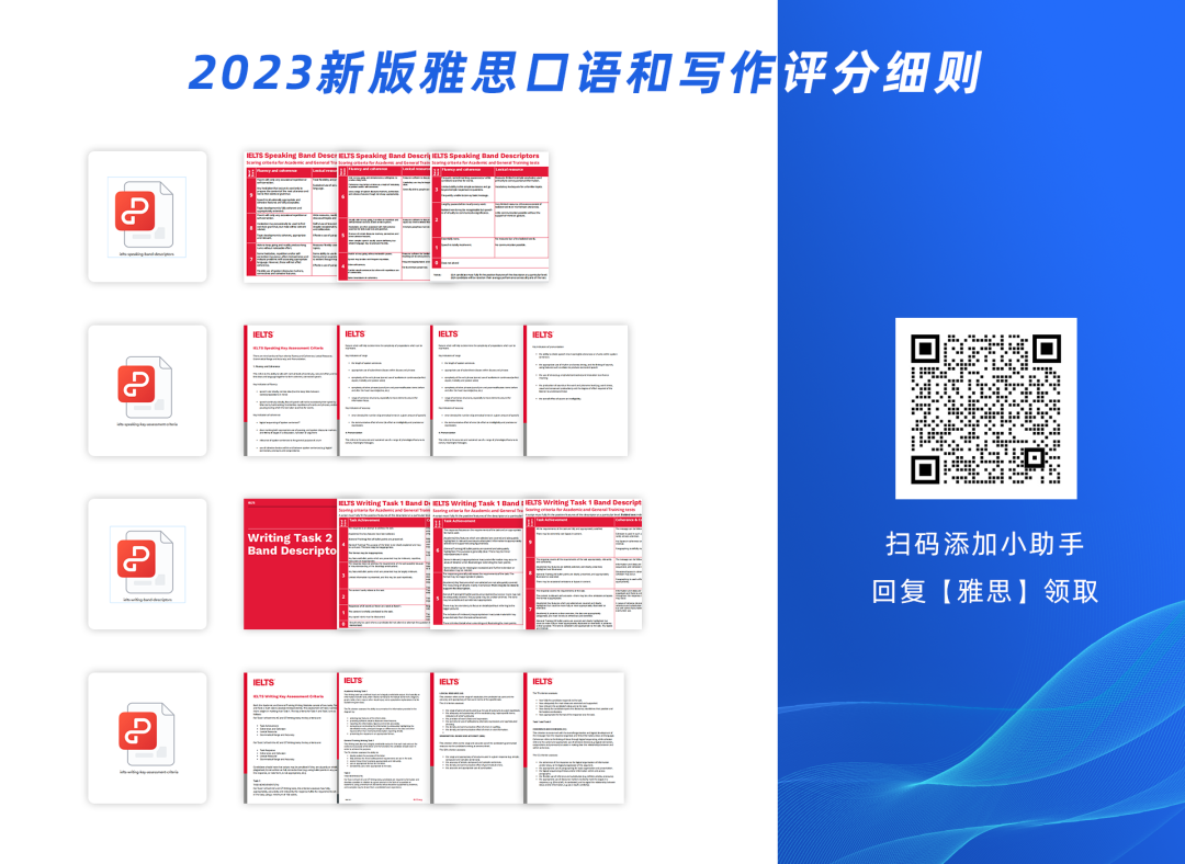 篇幅有限,如果想獲得2023年5月獲取新版的雅思口語和寫作的評分細則,我們幫大家收集好了