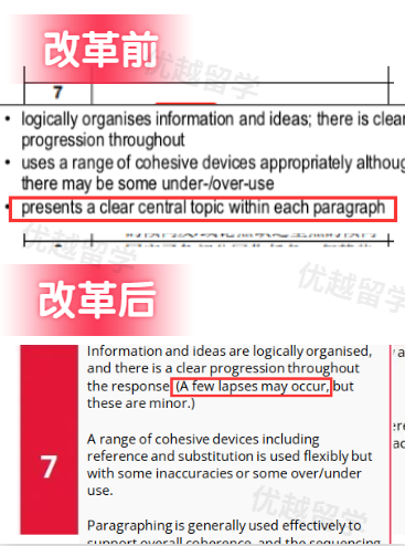 新版 評分標準中:7分的說法是“題目中的主要部分被合適地回應(the main parts of the prompt are appropriately addressed)”,評分標準允許了偶爾存在的信息缺失和失誤。