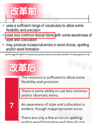 舊版 評分標準中:7分要求“使用不太常見的詞條”(use less common lexical items), 簡單說,就是要求使用高端表達。