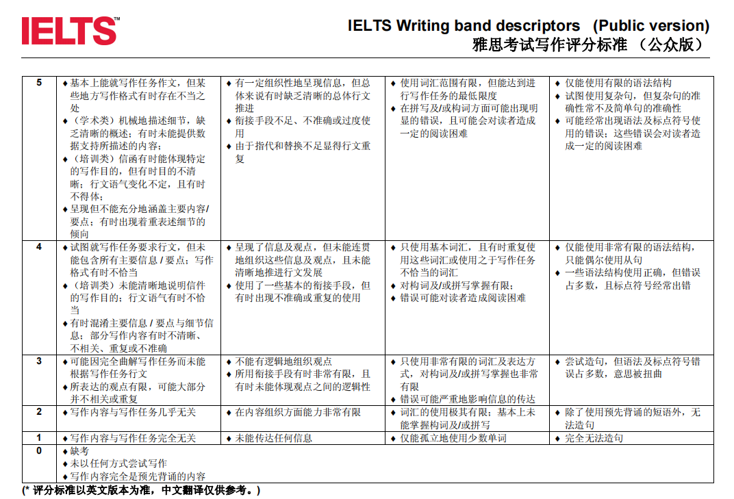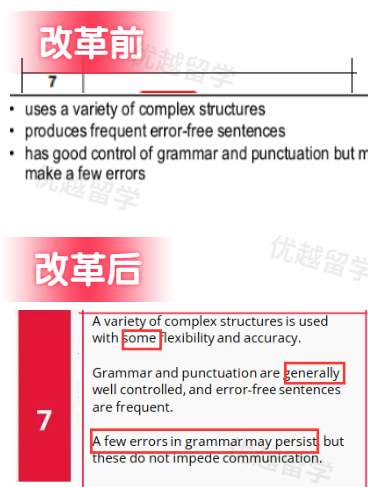 新版 評分標準中:7分標準里寫,語法和標點大體上控制得很好。并且,增加允許:“一些小錯誤持續存在”;6分的標準中也說:使用復雜句式時,準確度不必像簡單句的準確度那么高( examples of more complex structurs are not marked by the same level of accuracy as in simple structures)。