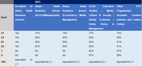 格拉斯哥大學將中國院校分為了7個不同的檔次(A1、A2、B1、B2、C、D、TNE),各有分數要求。