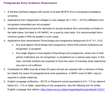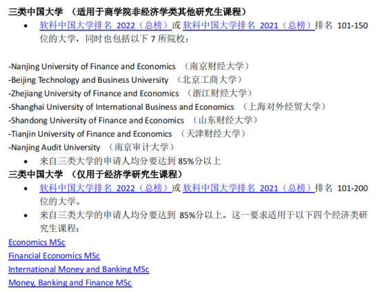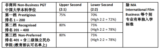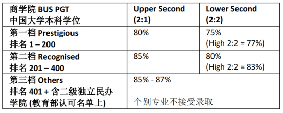 學術要求:2:1榮譽學位同等成績,中國院校有List,申請平均成績最低要求在70-93%不等。