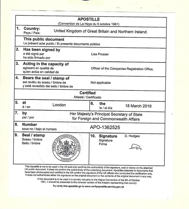 資質說明:中國公司在英國注冊成立后,需要得到英國外交部的認可才可以合法經營,此材料為外交與聯邦事務部蓋章的證明材料。