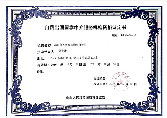資質說明:優越留學北京分公司曾獲得過自費出國留學中介服務機構資格認定書。不過目前教育部門已取消對自費留學中介的資質認定和監管,通告如下:http://www.moe.gov.cn/srcsite/A02/s5911/moe_621/201511/t20151126_221285.html